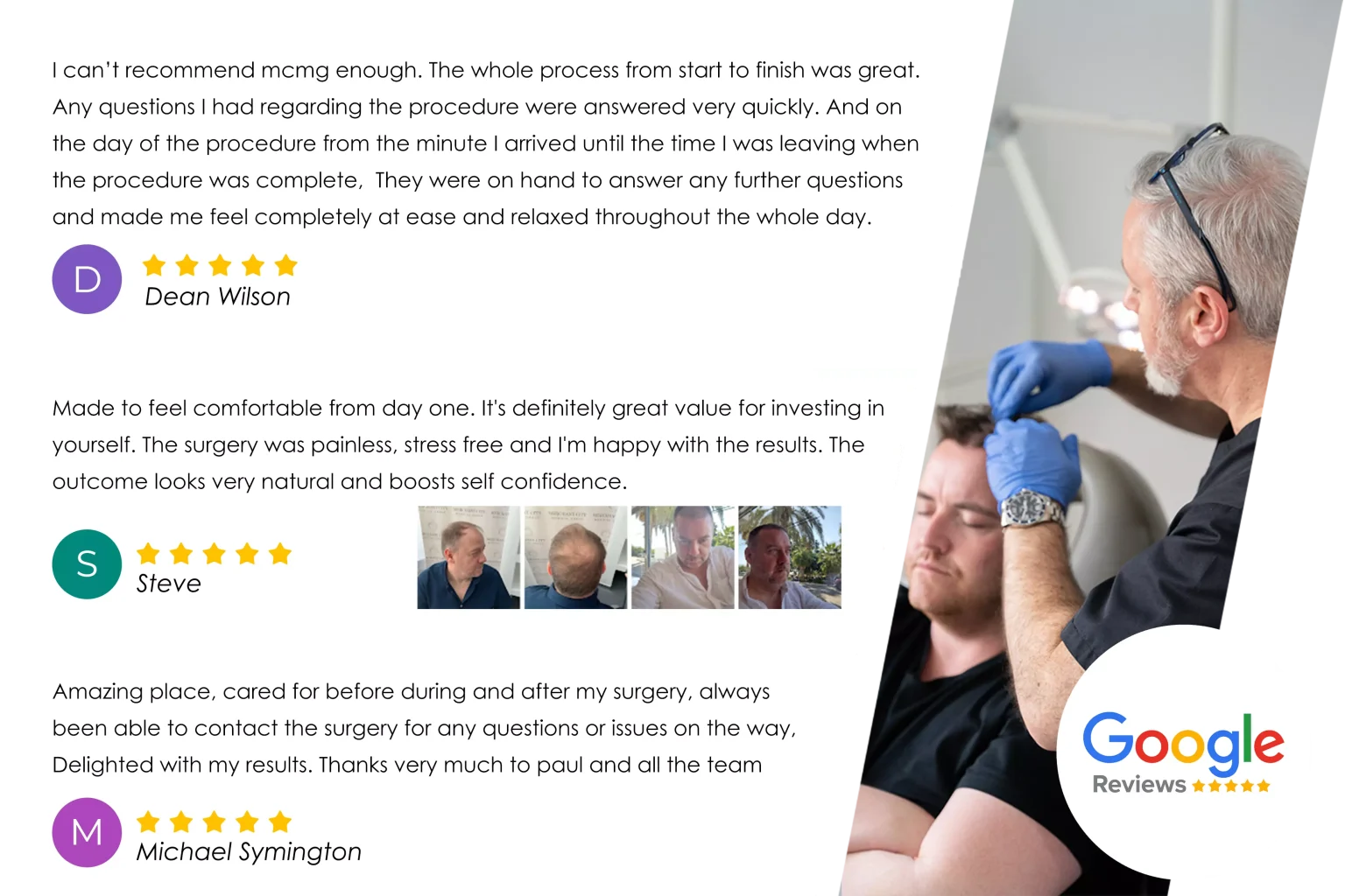Made to feel comfortable from day one. It's definitely great value for investing in yourself. The surgery was painless, stress free and I'm happy with the results. The outcome looks very natural and boosts self confidence. I'm only five months from the procedure and see great results already. I've had a great experience with MCMG and everyone there, I'd highly recommend you just do it... What is there to lose, not your hair!